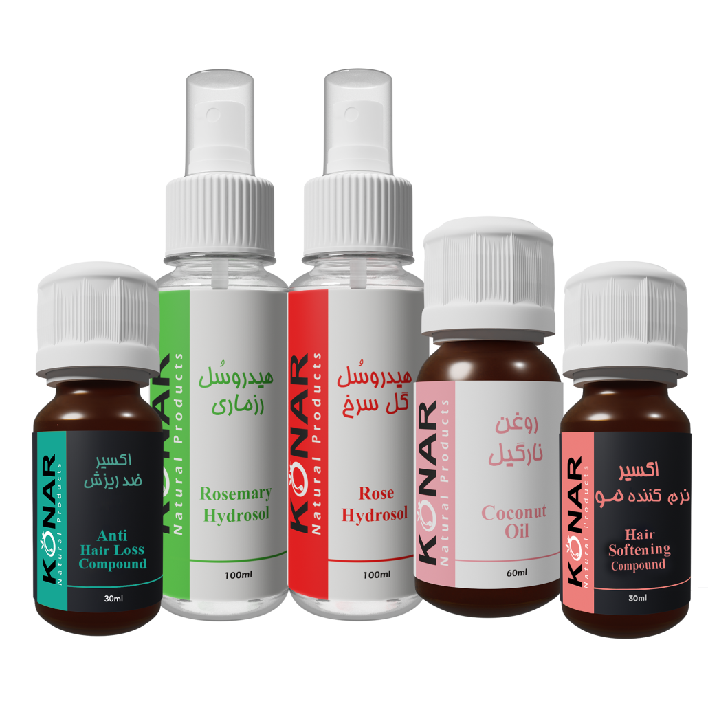 اکسیر ضد ریزش به همراه هیدروسل رزماری برای تقویت ریشه مو بسیار مفید است، روغن نارگیل نیز به منظور رطوبت رسانی به مو اهمیت زیادی دارد.